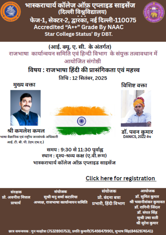 भास्कराचार्य कॉलेज ऑफ़ अप्लाइड साइंसिज़, दिल्ली विश्वविद्यालय के हिन्दी विभाग एवं राजभाषा कार्यान्वयन समिति के संयुक्त तत्वावधान मे हिन्दी दिवस के उपलक्ष मे दिनांक 12 सितंबर 2025 को “राजभाषा हिंदी की प्रासंगिकता एवं महत्व” विषय पर संगोष्ठी कार्यक्रम का आयोजन किया गया। कार्यक्रम मे बतौर मुख्य अतिथि भाषा विशेषज्ञ ITBP के कमांडेंट राष्ट्रीय संपर्क अधिकारी श्रीमान कमलेश कमल जी एवं विशिष्ट अतिथि IAS डाॅ.पवन कुमार जी प्रजापत, DANICS कैडर की उपस्थिति रही। दीप प्रज्वलन एवं सरस्वती वंदना के साथ कार्यक्रम की विधिवत शुरूआत हुई। वक्ताओ ने राजभाषा हिन्दी के बारे मे विस्तार से बताया। हिन्दी को बढावा देने की बात कही। भारतीय शिक्षा प्रणाली मे हिन्दी भाषा के महत्व के बारे मे बताया। हिन्दी हमारे व्यवहार मे कैसे आये इस पर भी काफी चर्चा की। पूर्व मे हिन्दी दिवस के उपलक्ष मे स्वरचित रचना लेखन प्रतियोगिता का आयोजन किया गया। प्रथम पांच स्थान प्राप्त बच्चो को अतिथियो के हाथो से पुरस्कार भी दिलवाया गया। यह कार्यक्रम राजभाषा हिंदी की महत्ता को बेहद सिद्ध करता है।